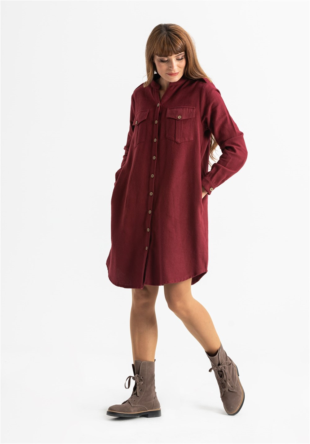 Toptan Uzun Kol Pazen Ayten Düğme Detaylı Gömlek Elbise Bordo (822.56)