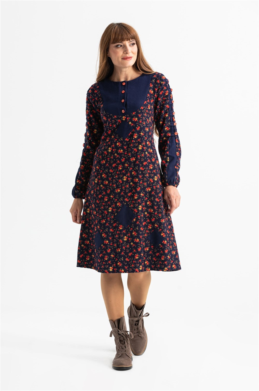 Toptan Uzun Kol Pazen Eftelya Sonbahar ve Kışlık Çıtır Desen Midi Boy Elbise Lacivert (822.55)