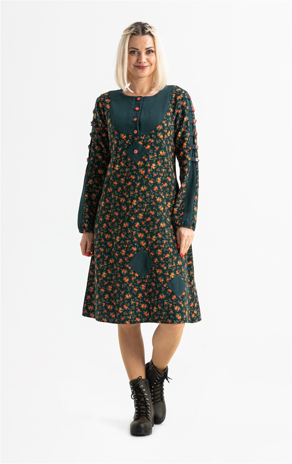Toptan Uzun Kol Pazen Eftelya Sonbahar ve Kışlık Çıtır Desen Midi Boy Elbise Petrol (822.55)
