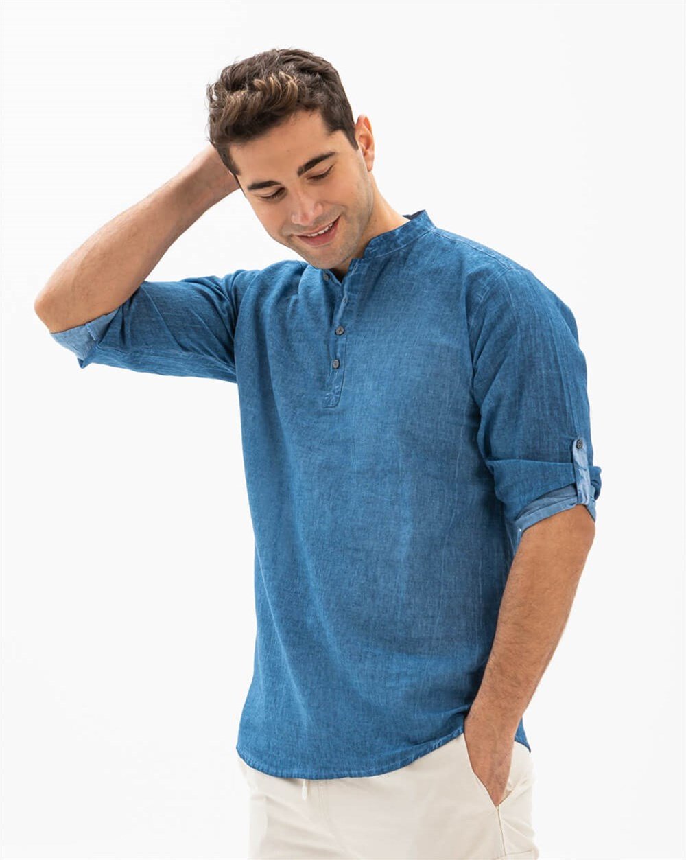 Toptan Uzun Kol Şile Bezi Bodrum Erkek T-Shirt Kot Mavi