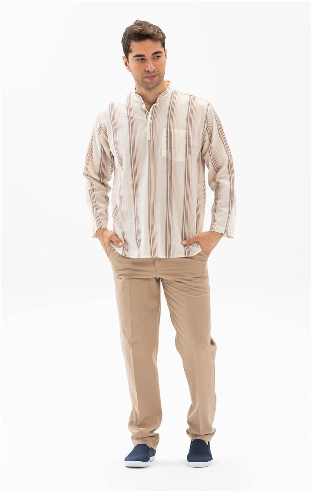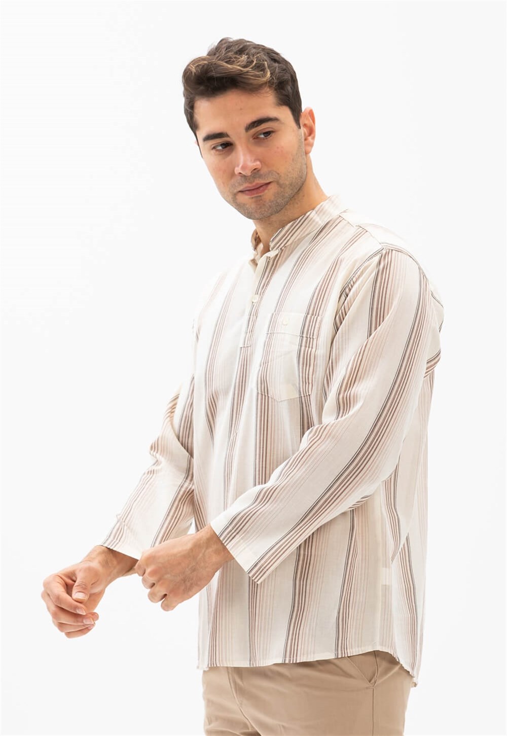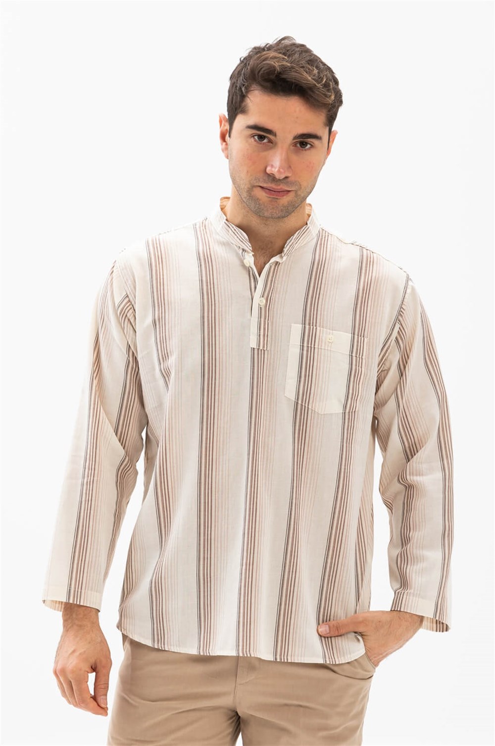 Toptan Uzun Kol Şile Bezi Hakim Yaka Erkek Tshirt Krem Kahve Çizgili (182.04)