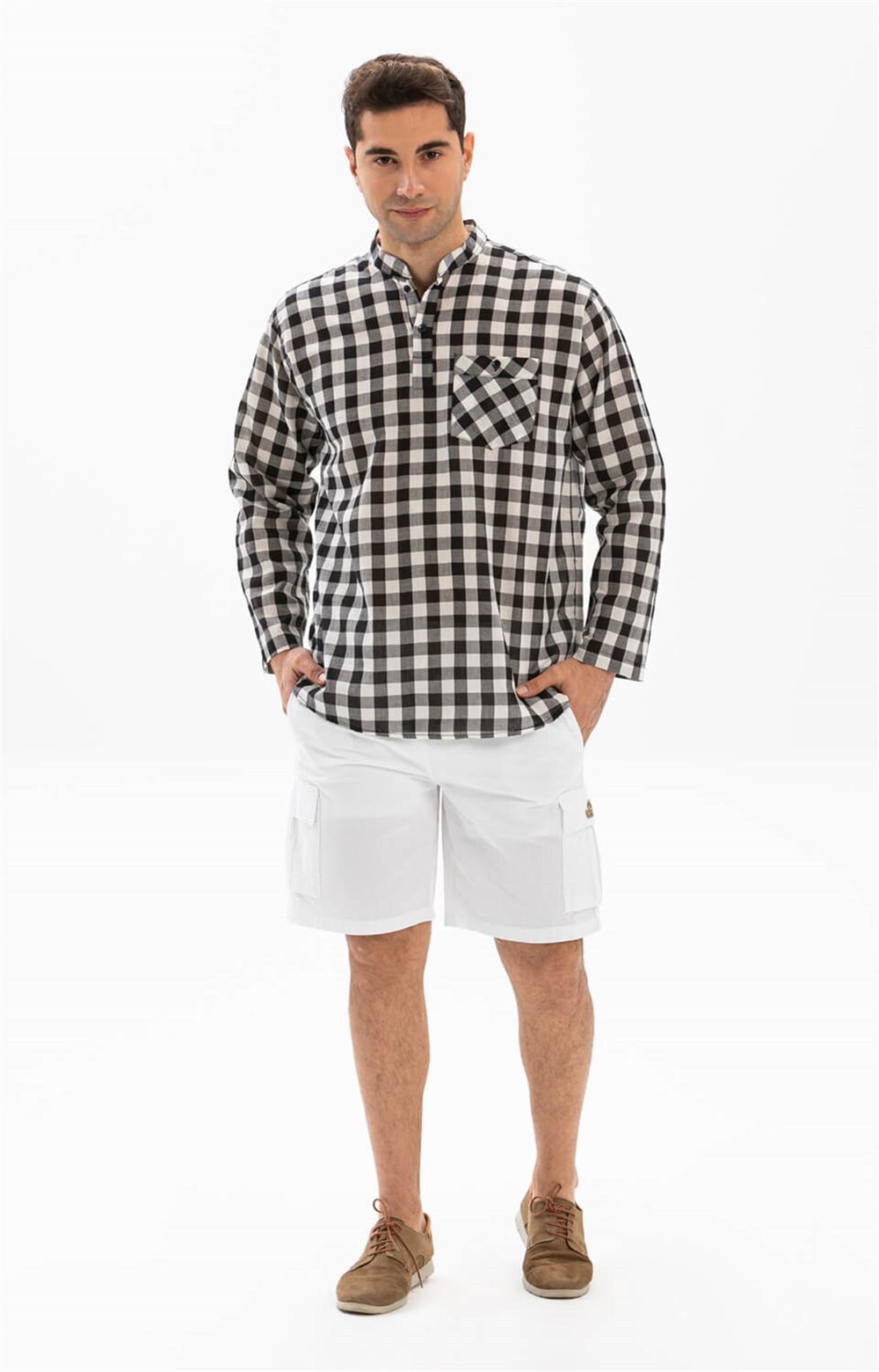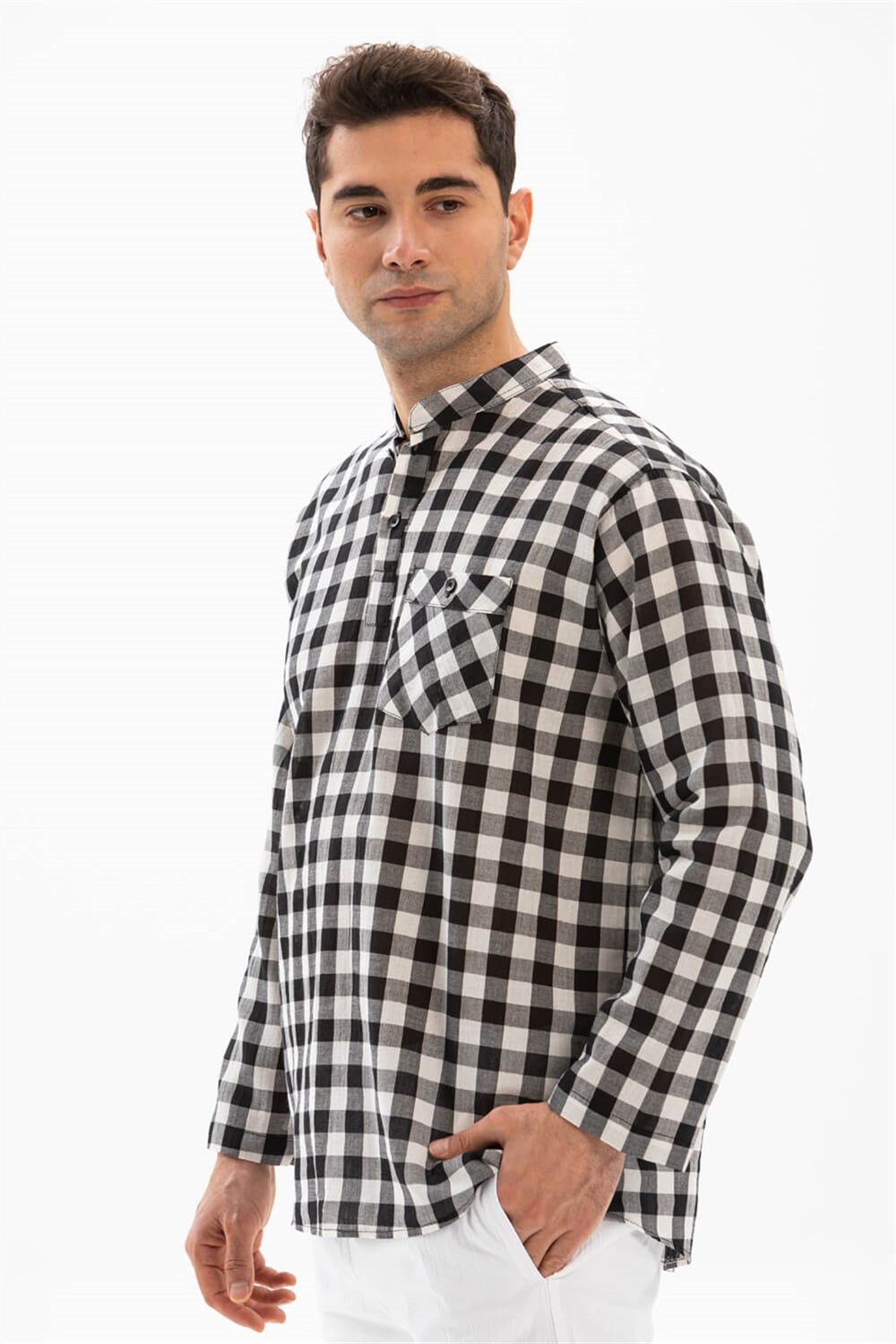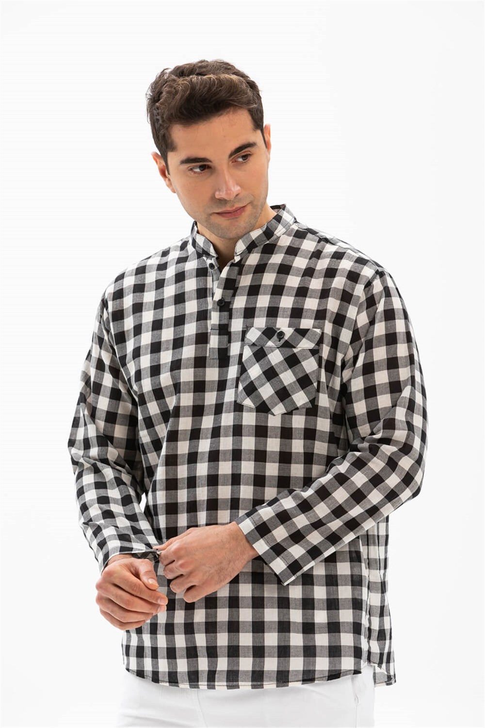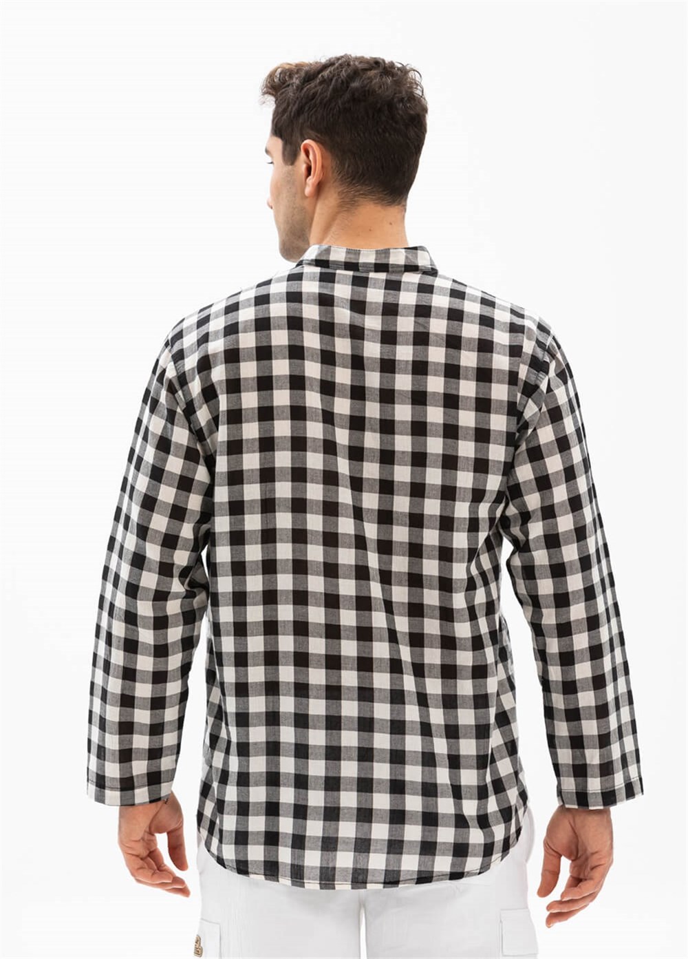Toptan Uzun Kol Şile Bezi Hakim Yaka Erkek Tshirt Siyah Beyaz Kareli (182.04)